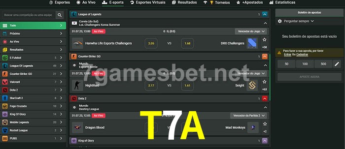A aposta T7A oferece aos jogadores a experiência mais conveniente de apostas em eSports!